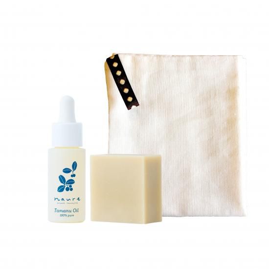 ナウレ タマヌオイル100ピュアとタマヌオイルの洗顔石鹸、星めぐり石鹸工房のある青葉仁会さんで縫製して作られた「AOHANIガーゼフェイスタオル」がセットになりました。デリケートなお肌にも安心してお使いいただけるギフトセットです。この時期だけの特別な価格で10%OFFでお求めいただけます。