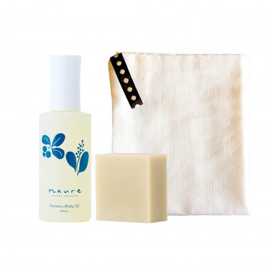 ナウレ タマヌボディオイルとタマヌオイルの洗顔石鹸、星めぐり石鹸工房のある青葉仁会さんで縫製して作られた「AOHANIガーゼフェイスタオル」がセットになりました。デリケートなお肌にも安心してお使いいただけるギフトセットです。この時期だけの特別な価格で10%OFFでお求めいただけます。